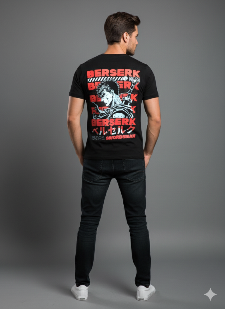 Дизайн: Уникальный принт "Berserk" расположен как на передней, так и на задней стороне футболки, обеспечивая стильный и узнаваемый вид со всех сторон.