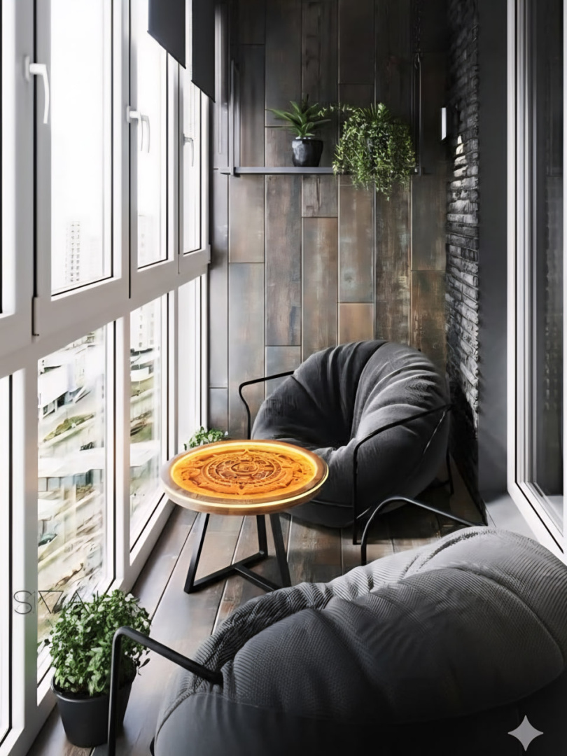 Мы сделали столик «Майя» — с резьбой, как у солнечного камня, и оранжевой подсветкой, которая всё меняет.
