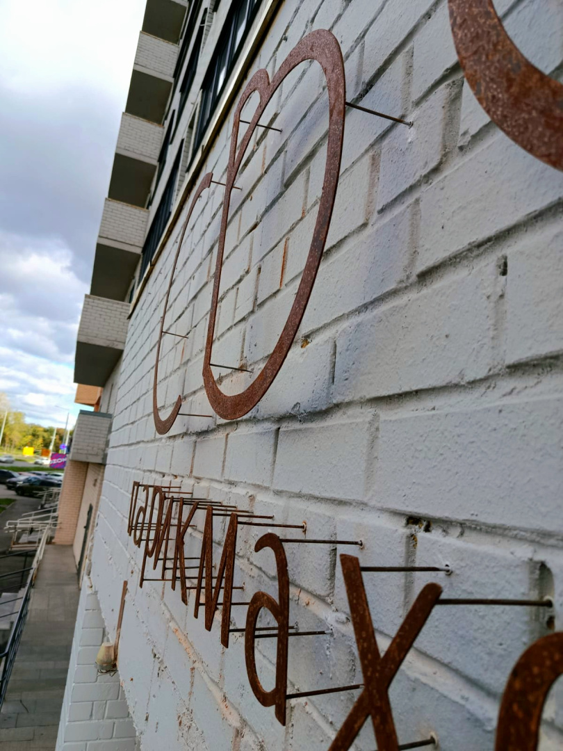 Мы сделали вывеску для парикмахерской «Своя» — металлические буквы с эффектом благородной ржавчины.